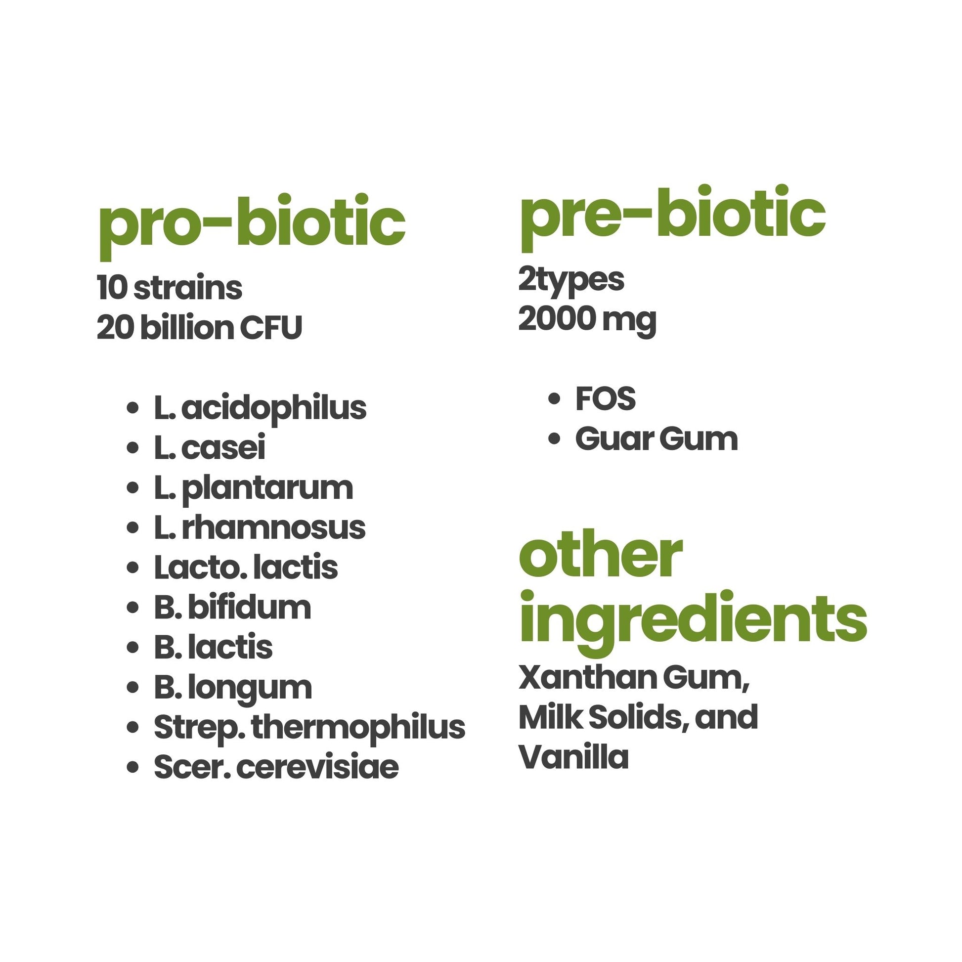 Probiotics [20 Billion CFU]: L. acidophilus, L casei, L. plantarum, L. rhamnosus, Lactococcus lactis, Bifidobacterium bifidum, Bifidobacterium lactis, Bifidobacterium longum, Streptococcus thermophilus, Saccharomyces cerevisiae