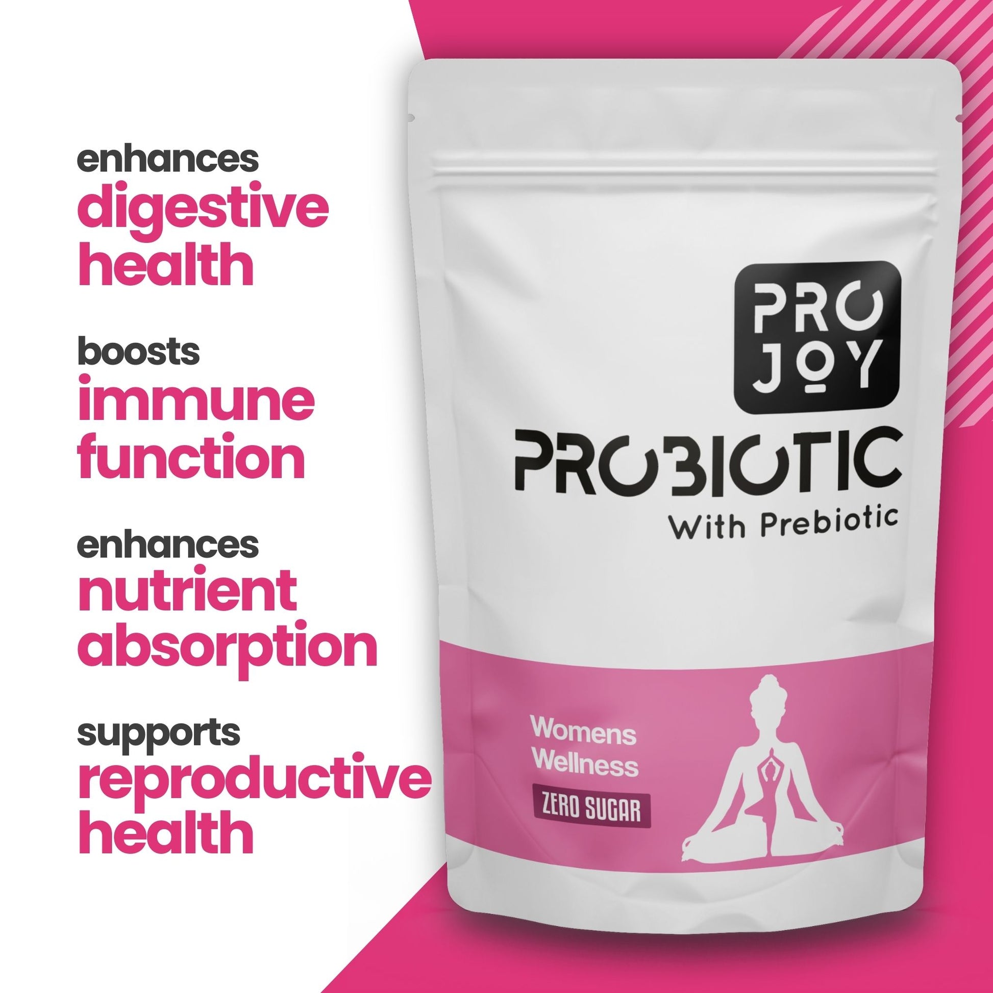 Common concerns include menstrual health, hormonal imbalances, bone health, thyroid disorders, and mental health challenges. Projoy Women’s Wellness Probiotic with Prebiotic supports overall wellness by promoting gut health, which plays a critical role in hormonal balance and immunity.